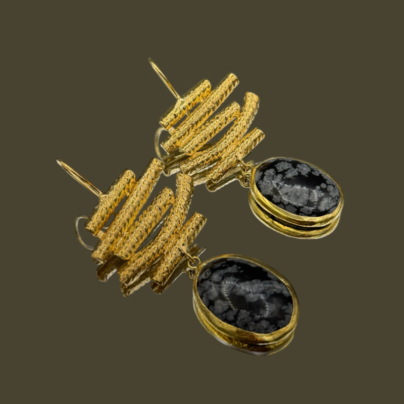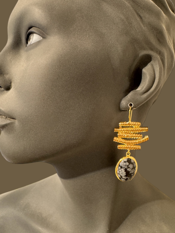 Aparte artisan oorbellen van 24k over messing, met haken en ovale zwart witte jasper stones. De totale lengte is 7,3 cm.