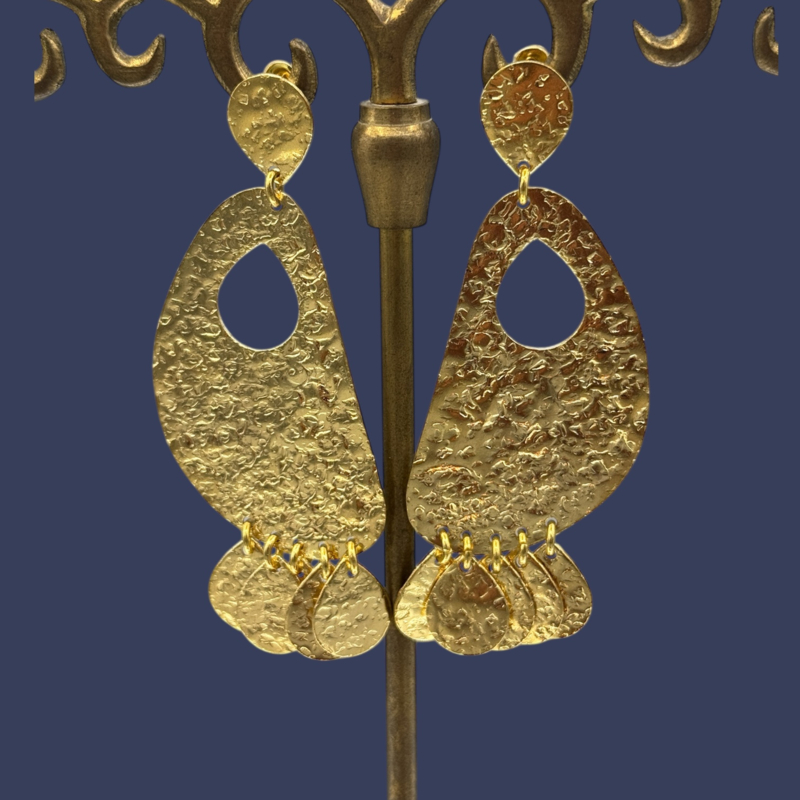 Mooie gold plated (over messing) oorbellen met stekers en hangers van gehamerde structuur. De totale lengte is 8,5 cm.