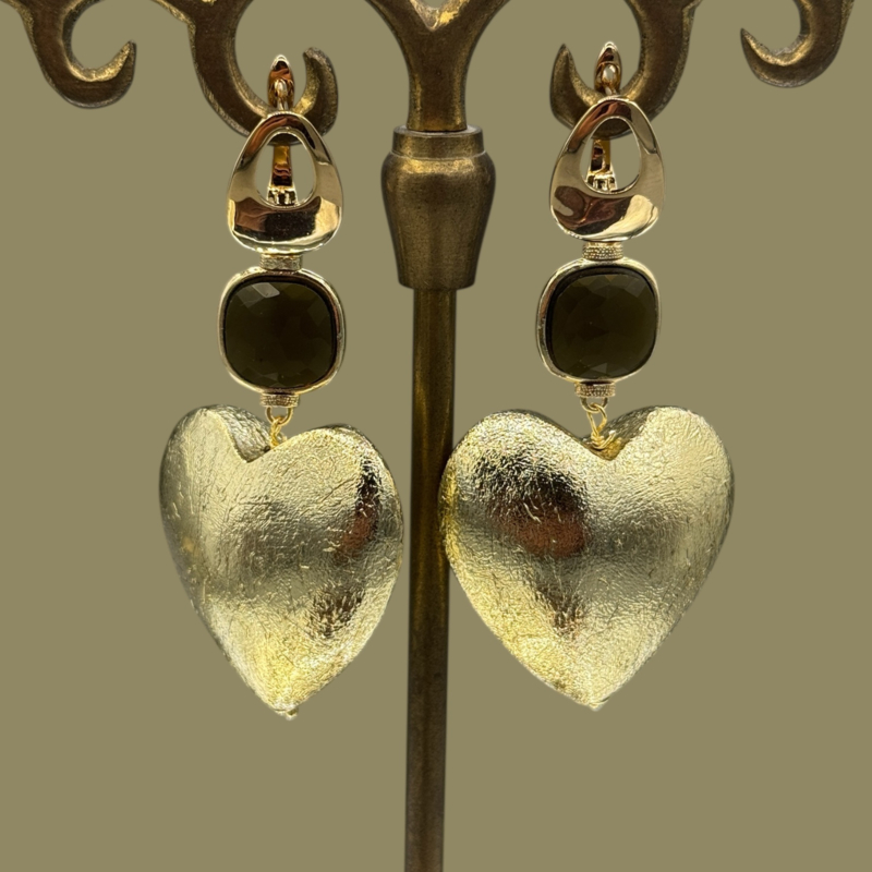 Mooie 24k goud vergulde (over messing) oorbellen met aparte stekers met kliksluiting en eronder bruine kristal cushions en brushed golden hearts. Niet zwaar. De totale lengte is 7 cm.