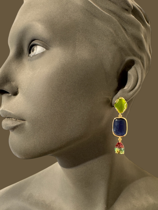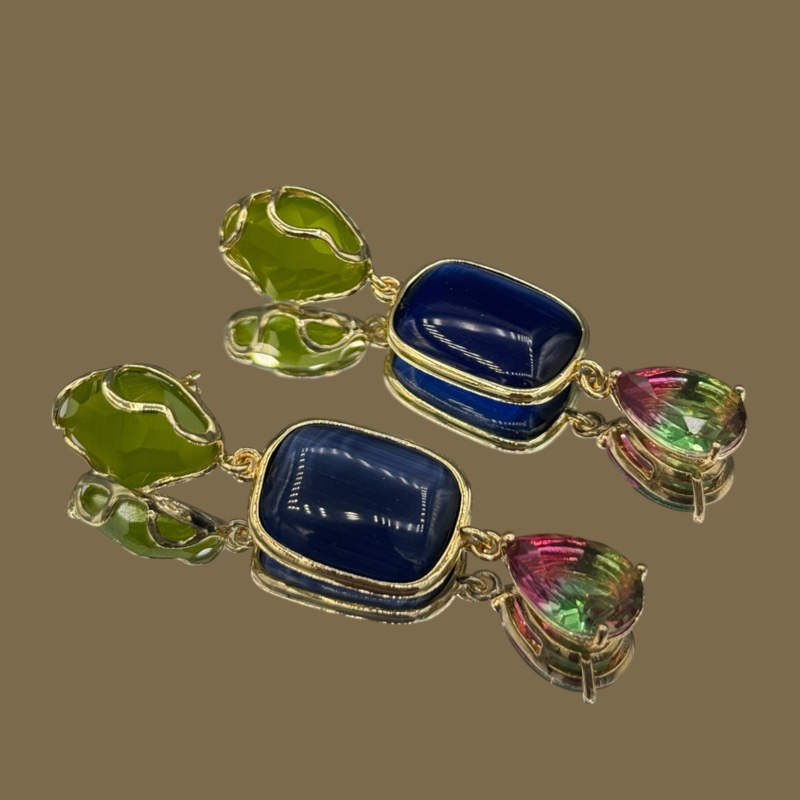 Mooie handgemaakte 24k goud vergulde (over messing) oorbellen met groene cateye stekers en eronder donkerblauwe cateye. Onderaan zijn multi color kristaldruppels. De totale lengte is 6 cm.
