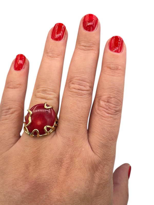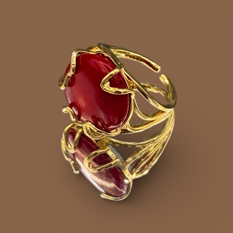 Mooie verstelbare 24k goud vergulde (over messing) ring met bamboo koraal. De basis valt normaal.