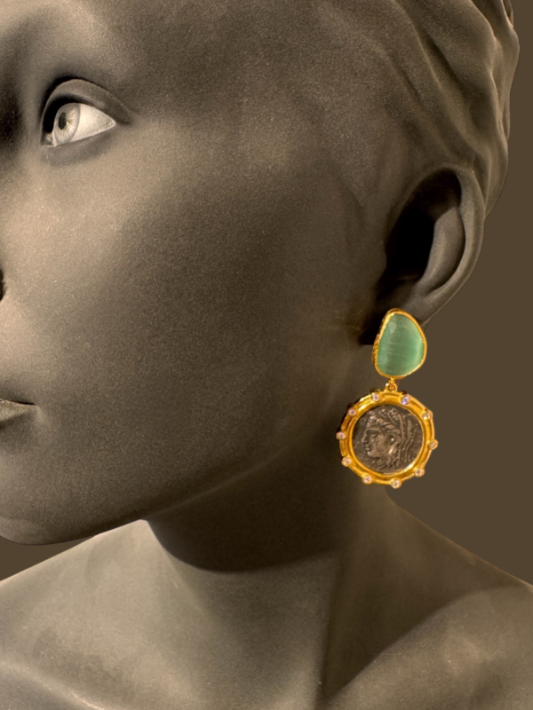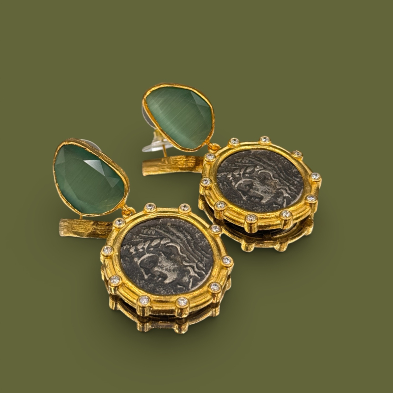 Mooie 24k goud vergulde (over messing) oorbellen met stekers van aqua cateye en hangers van romeinse munten en zirconia's. De totale lengte is 5,5 cm.