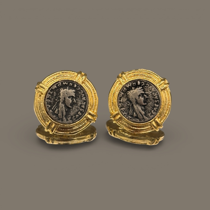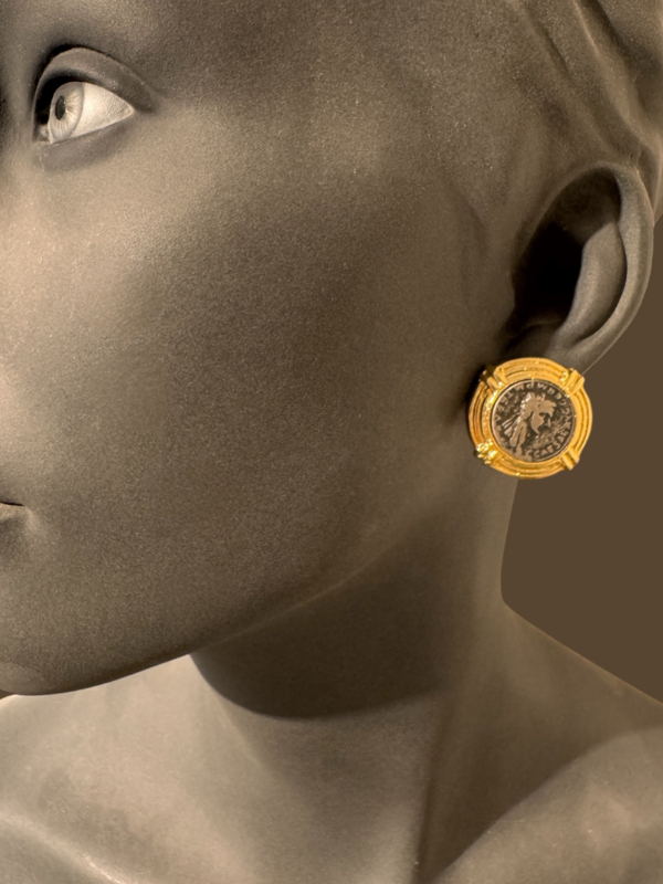 Mooie 24k goud vergulde (over messing) oorbellen met stekers van romeinse munten. De doorsnee is 2,5 cm.