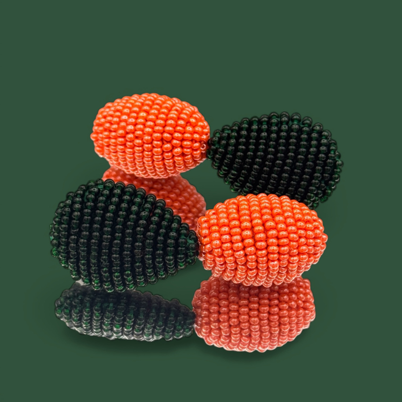 Mooie vermeil (24k over sterling zilver) oorbellen met gladkraaltjes in donkergroen en koraal tintjes. Helemaal handgeregen. De stekers zijn ietwat buigzaam wat zo hoort. De totale lengte is 5,4 cm.