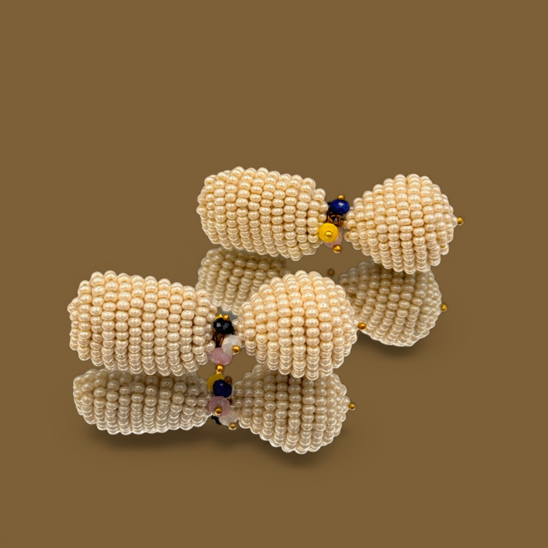 terugMooie helemaal met de hand gemaakte oorbellen ( geregen parelgloed glaskraaltjes op zijdedraad) met stekers van 24k goud vermeil (over sterling zilver) en tussen beide elementen nog vrolijk gekleurde glaskraaltjes. De totale lengte is 4,3 cm. Dotjes.
