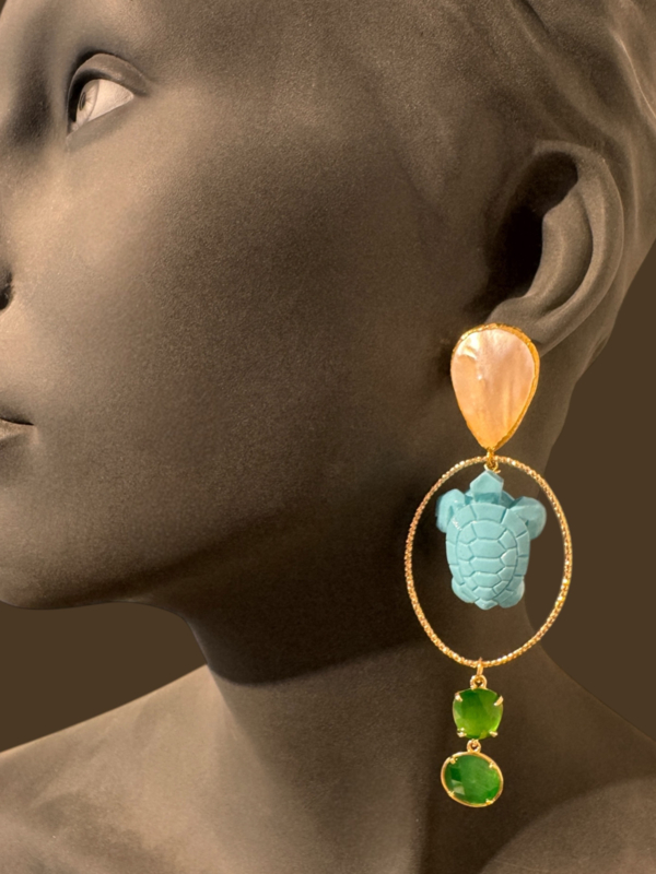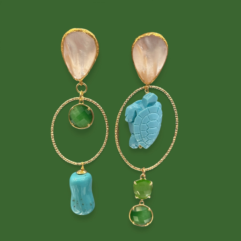 Mooie mismatched oorbellen van 24k goud (over messing) verguld met parelmoer stekers en hangers van turquoise resin en cateye. De langste oorbel met turtle is 10,5 cm.