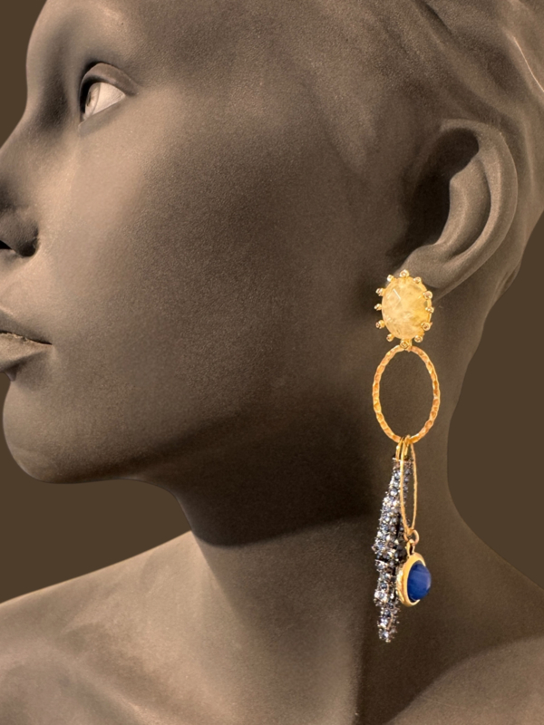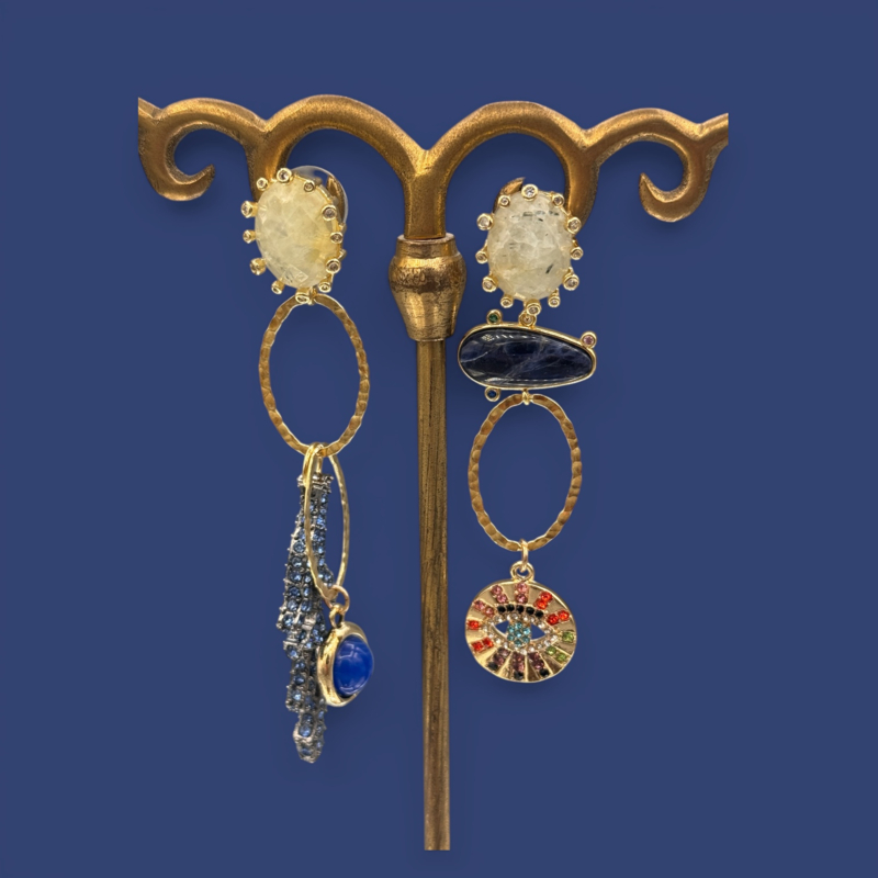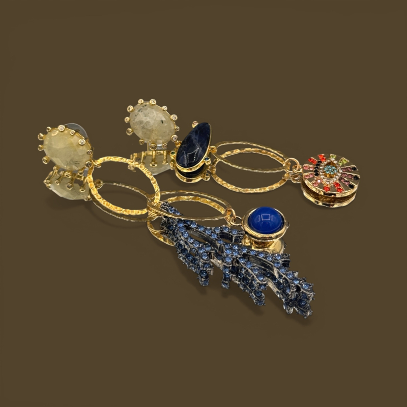 terugMooie mismatched handgemaakte unieke oorbellen (slechts 1 paar van gemaakt) van 24k goud over messing. De stekers zijn van prehniet edelstenen met zirconia/s en eronder aan vermeil schakels hangen diverse bedels, zoals oa van sodaliet, kristal en resin. De totale lengte van de langere oorbel met coral branch in blue is 10 cm.