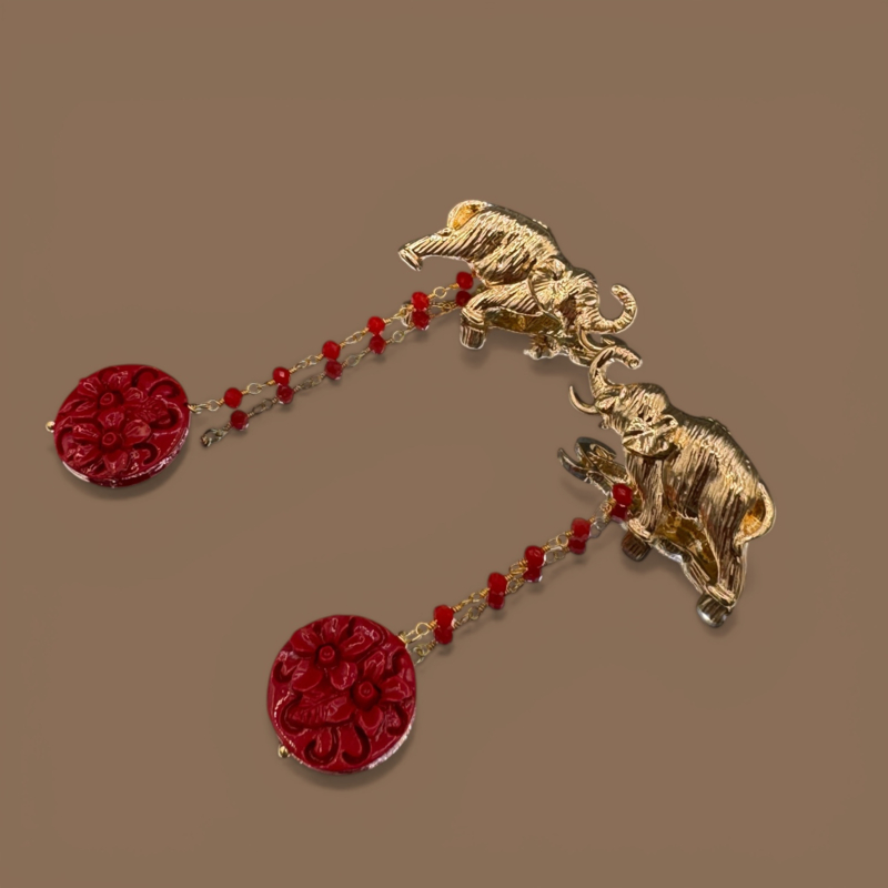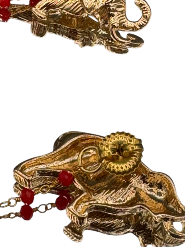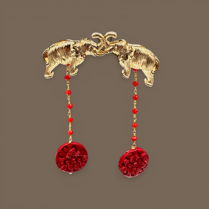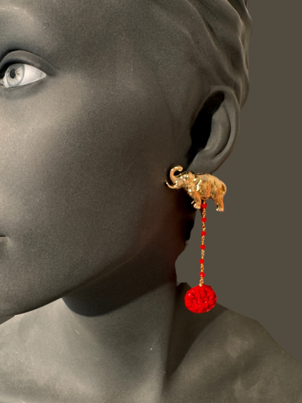 terugGeweldige vrolijke handgemaakte oorbellen waar maar 1 paar van gemaakt is. Met olifantjes als steker en aan het achterkantje is een vermeil kettinkje bevestigd met rode kristalletjes en onderaan carved resin coins. Doordat het achterkantje het hang deel heeft is het gewicht ook mooi verdeeld. Bovendien kun je deze achterkantjes evt aan je andere oorbellen bevestigen.