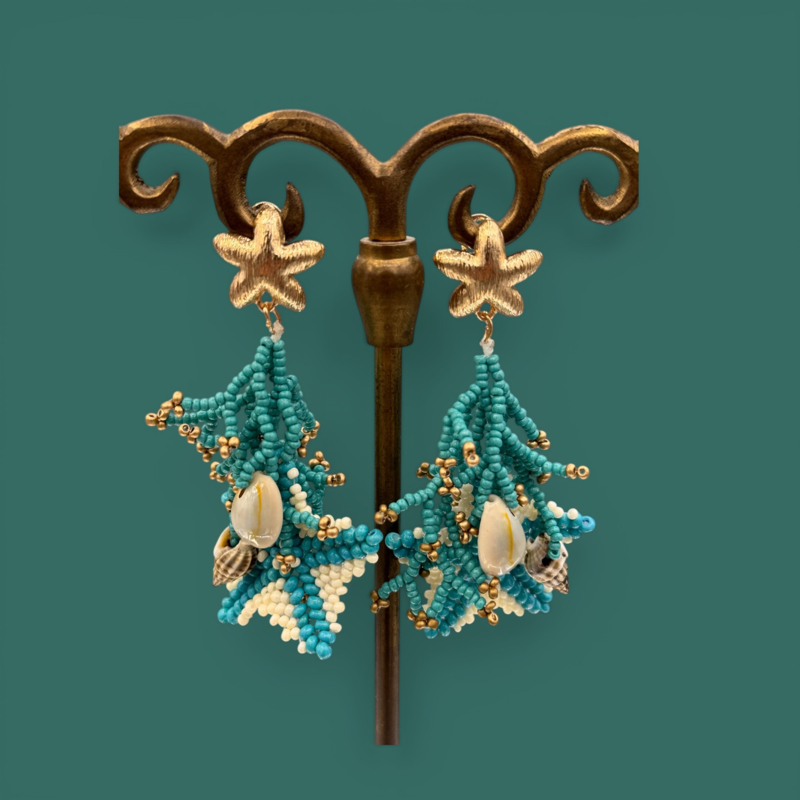 terugMooie handgemaakte oorbellen met zeester stekers met klapsluiting en eronder hangers van turquoise en wit beige kraaltjes. De perfecte zomer oorbellen. Slechts 1 paar beschikbaar.