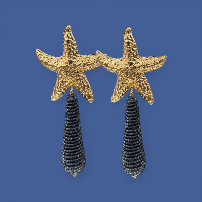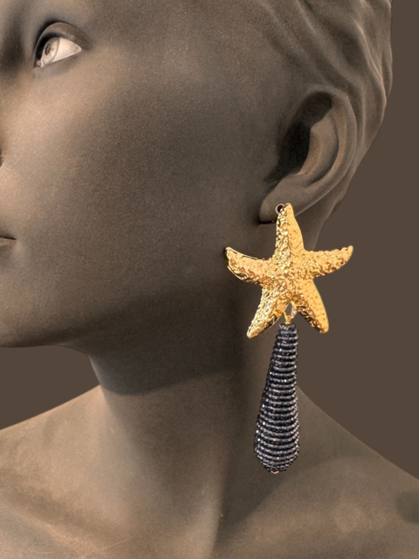 Opvallende unieke statement oorbellen met gehamerde zeester stekers en lange druppels van donkerblauwe glassberry's. Gewicht circa 11 gram. De lengte is 11 cm.