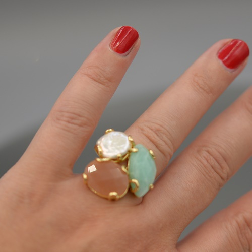 terugMooie goldplated ring met een maanstee een amazoniet steen en zoetwaterparel. Ik heb de ring op de foto om met een ringmaat 16. De ring is nog verstelbaar.